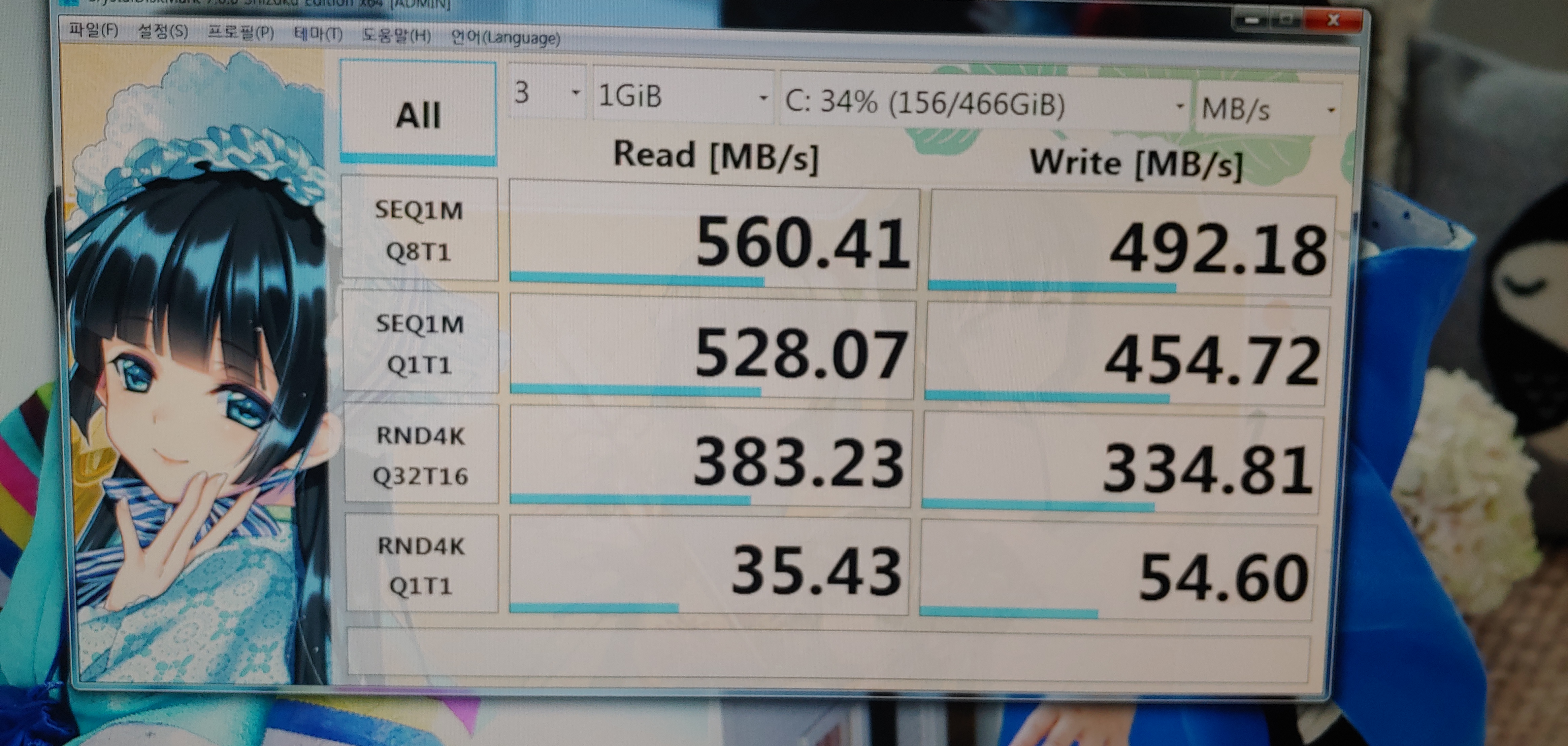 일반 SSD를 사용하고 있던 컴퓨터에서 디스크 속도 측정하면 아래와 비슷한 결과 값을 볼 수 있습니다. (기존 컴퓨터)