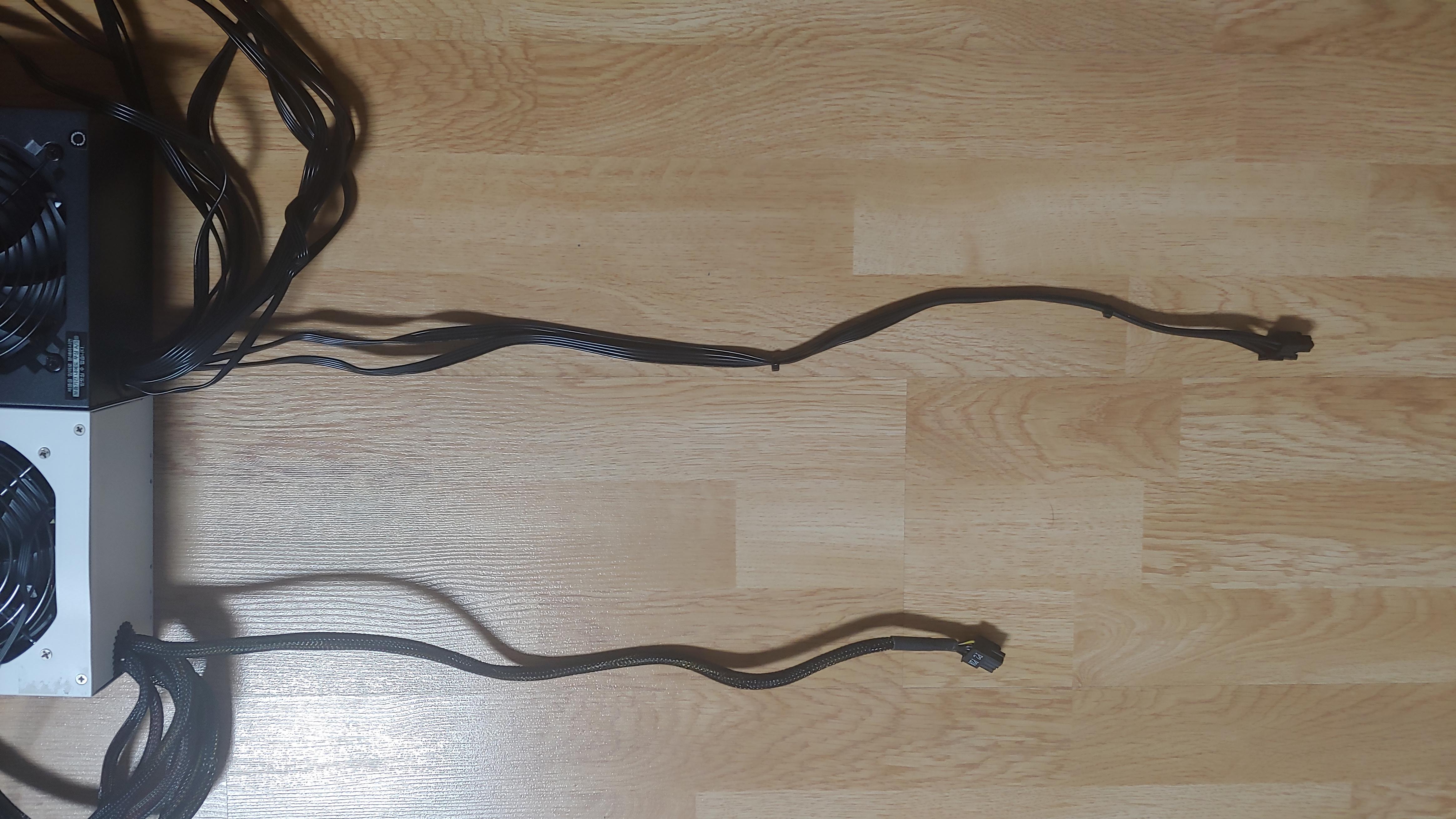 4+4핀 CPU 전원 케이블 길이 비교입니다. ABKO SUITMASTER SETTLER 위(700mm), 기존 사용 제품이 아래(500mm)